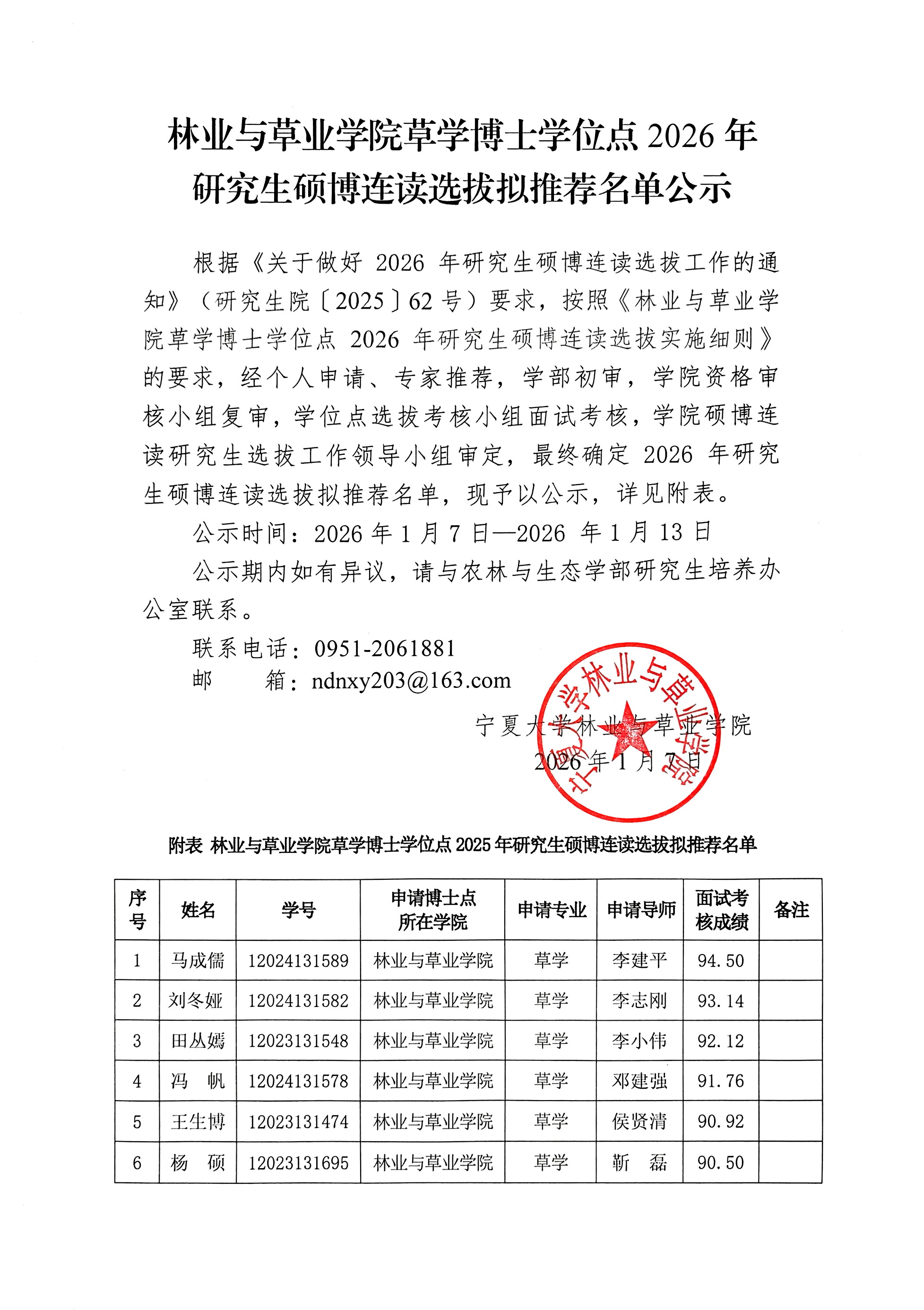 林业与草业学院草学博士学位点2026年研究生硕博连读选拔拟推荐名单公示